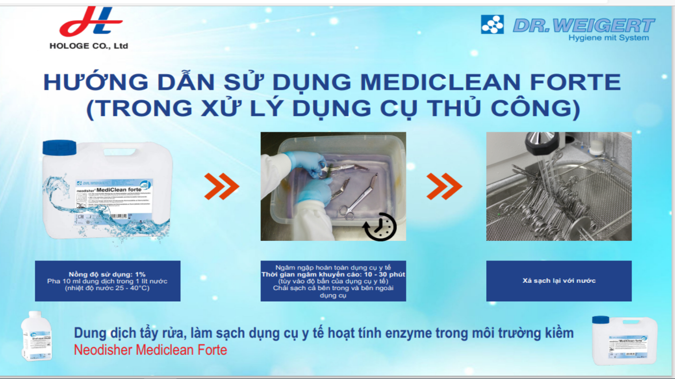 Bước 3: Ngâm với dung dịch khử khuẩn mức độ cao Neodisher septo Active đối với dụng cụ không chịu nhiệt hoặc hấp nhiệt độ cao với máy hấp tiệt khuẩn hơi nước