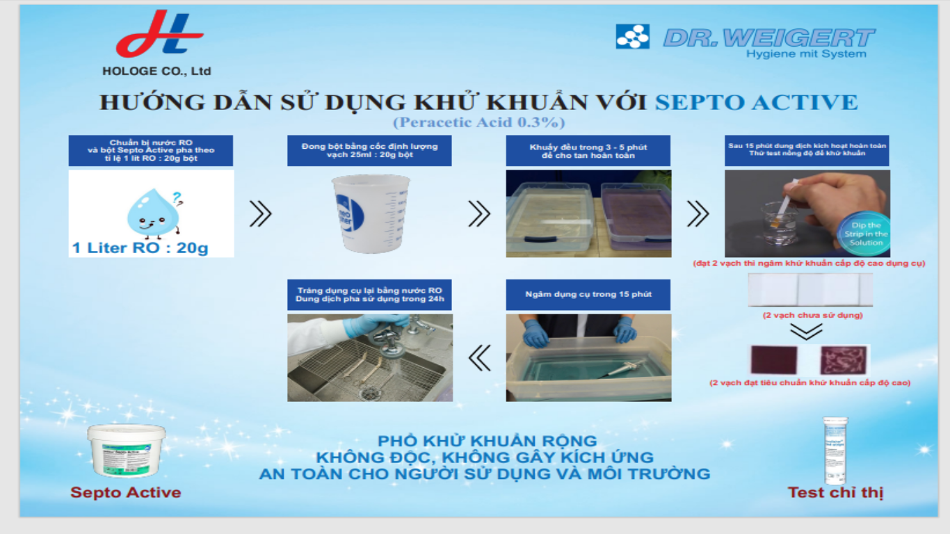 -Pha hóa chất khử khuẩn theo đúng hướng dẫn (xem phụ lục pha)